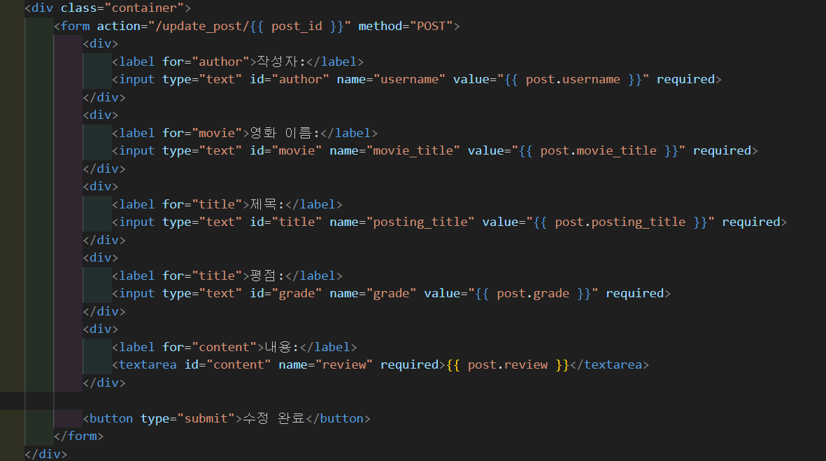 해결의 실마리: 게시물 수정시에는 기존에 게시물 작성에서 받았던 입력폼 그대로에 db에 저장되어 있는 내용이 각 입력칸에 들어가 있어야 했다. 따라서 게시물 작성.html을 최대한 활용하되, 게시물 작성.html에 게시물 수정까지 구현하는 것보다는 별도로 게시물 수정.html을 만들어서 사용(게시물 작성.html 최대한 활용)하는 것이 쉬울 것 같아서 그렇게 하기로 했다.