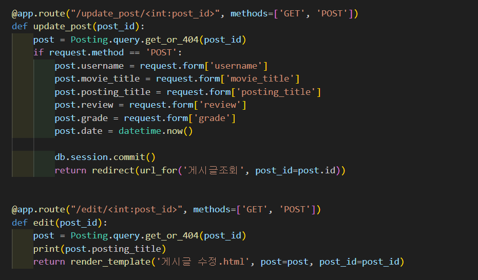 문제상황: 처음에는 게시물 수정을 새로운 html을 만들어서 할 건지 아니면 기존의 게시물 작성.html을 활용할 것인지도 결정을 하지 못했다. 그러다보니 자연스레 app.py와 update_post()의 로직도 꼬여버리는 문제가 발생했다
