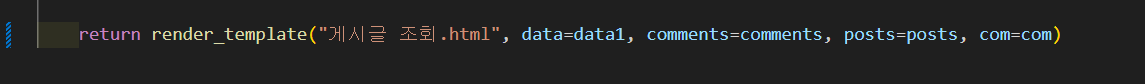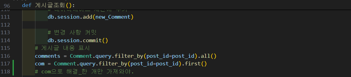 이때도 url지정에서 애를 먹었는데, app.py에서 게시물 조회.html에 렌더링시에 함께 넘겨주는 변수 comment는 db에서 filter결과를 전부 담고 있는 것이어서(all()) Not Found오류가 났다고 판단되어서, com이라는 변수를 새로 만들어서 filter해서 하나만 데이터를 담아서(first()), html단으로 함께 넘겨주니 모든 출력이 원하는대로 나왔다.